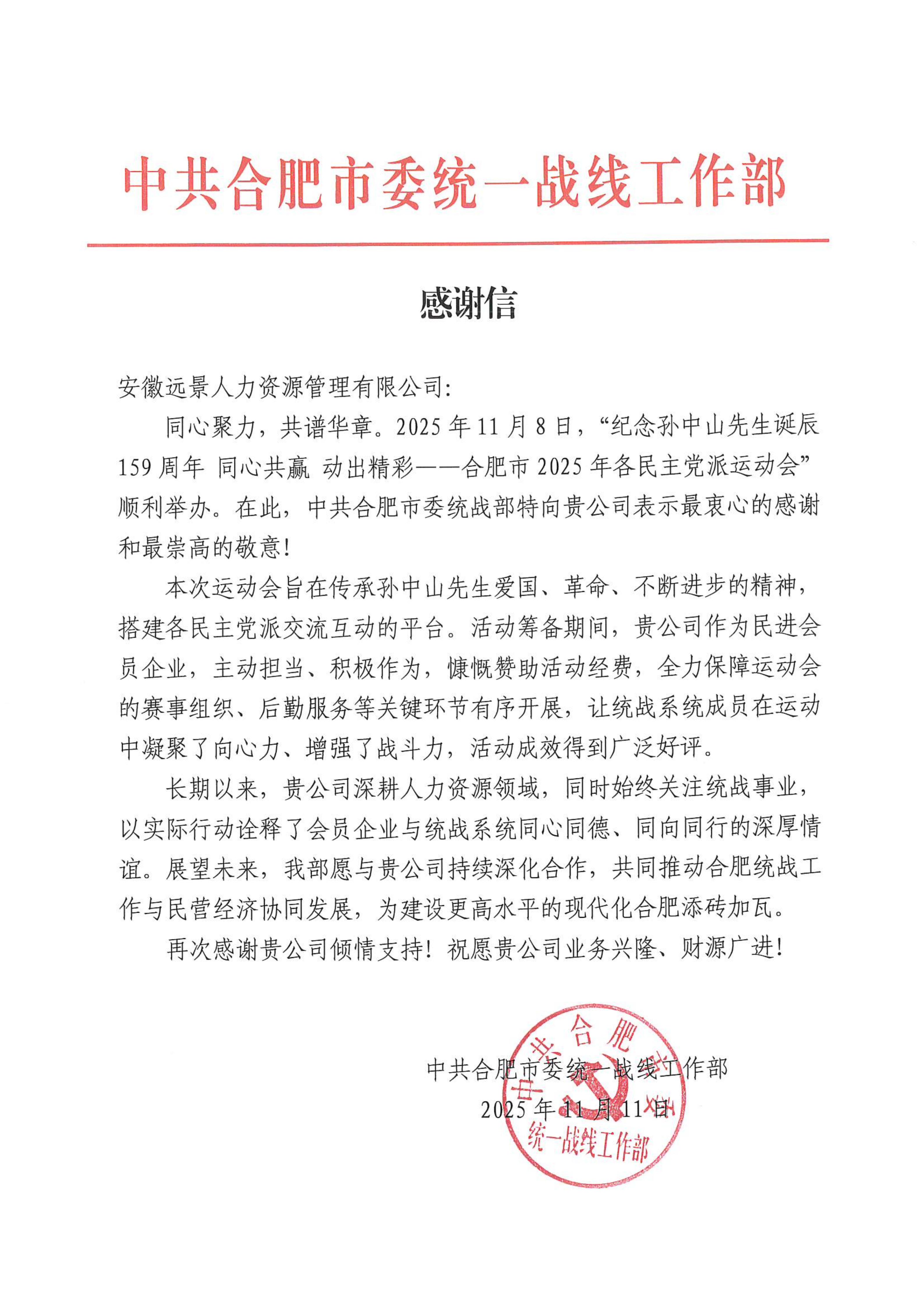 今日,安徽远景人力资源管理有限公司收到中共合肥市委统一战线工作部发来的感谢信,信充分肯定了公司在“合肥市2025年各民主党派运动会”中的突出贡献。作为民进会员企业,远景人力以资金支持、后勤保障及宣传协助等实际行动,为活动圆满举办提供坚实支撑,彰显民营企业与统战系统的同心担当。