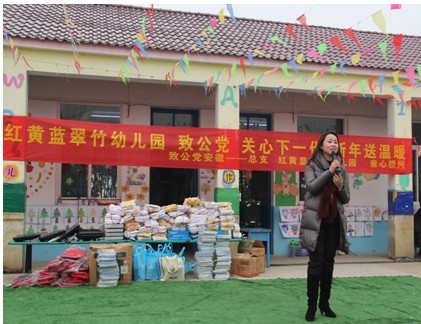 1月13号上午,我公司总经理、致公党安徽省委妇委会委员春梅女士顶着严寒前往地处偏远的肥西县王集乡,去看望金色童年幼儿园的孩子们。为孩子们送去了急需的教具、书籍、衣物,同时也送去了新年的祝福和问候,孩子们个个欢哥雀跃,虽然三九严寒,寒风凛冽,但现场暖意融融,欢乐祥和的气氛回荡在整个捐赠活动现场的上空……